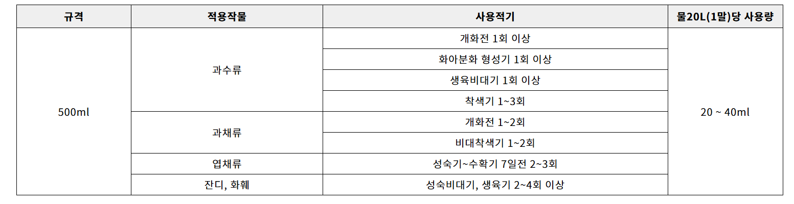 3. 칼슘 결핍으로 인한 낙과·불량과를 예방하고 저장성을 향상시켜줍니다.
