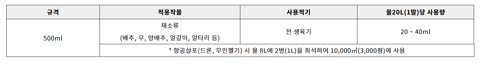1. 배추와 무의 생육특성에 맞춰 개발한 제품으로, 배추의 결구, 무 크기 증대 등 상품성 향상에 효과적인 생리활성증진제입니다.