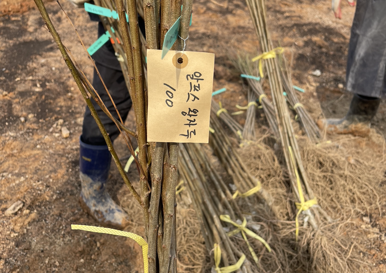 - 4. 묘목을 구덩이에 넣고, 뿌리가 고르게 펼쳐지도록 합니다. 그 후 흙을 덮고, 흙을 살짝 눌러줍니다.