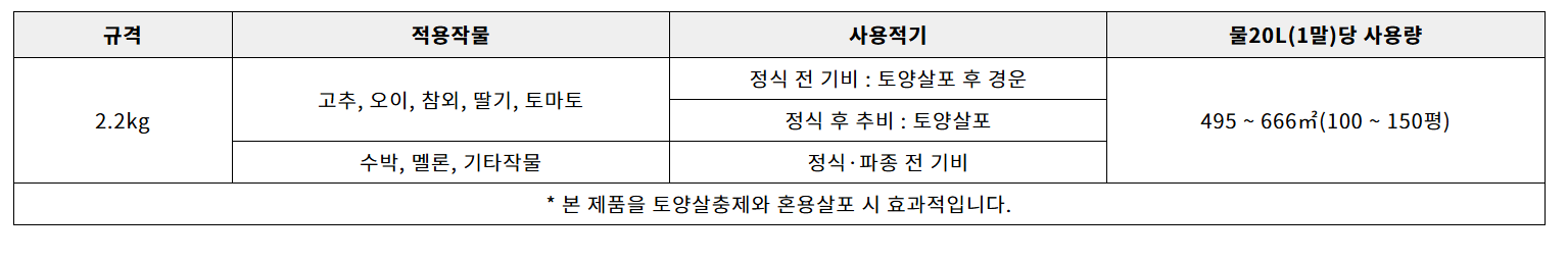 1. 천연광물질, 부식산, 아미노산 등을 함유한 제품으로 토양개량 효과가 뛰어납니다.2. 염류장해 경감, 토양내 유용미생물 활성화, 뿌리발달 및 활착에 도움을 줍니다.3. 미세유황 성분을 함유하고 있어 토양내 장해에 대한 내성을 증대시켜줍니다.4. 연작토양, 하우스토양, 유기물이 적은 토양 등 영양분 불균형 해소에 효과적입니다.5. 생리장해 및 환경장해 예방 및 회복, 내병성 증대, 품질향상, 착과향상, 수량증대 등에 도움을 줍니다.보증성분량