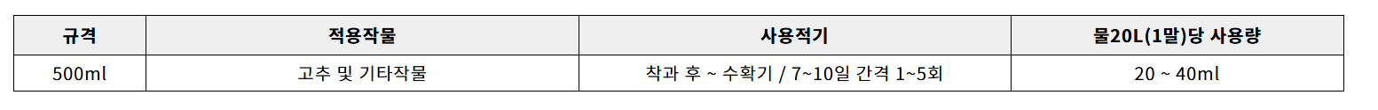 2. 고온기의 온도장해로 인한 개화, 수정, 착과 불량을 빠르게 회복시킵니다.3. 고추 꼭지가 약해져 떨어지는 낙과 현상을 예방하고 회복시킵니다.4. 양분 흡수를 빠르게 도와 고추의 비대효과가 우수합니다.5. 고추의 생리작용을 활성화시켜 환경 장해에 대한 내성이 강해집니다.