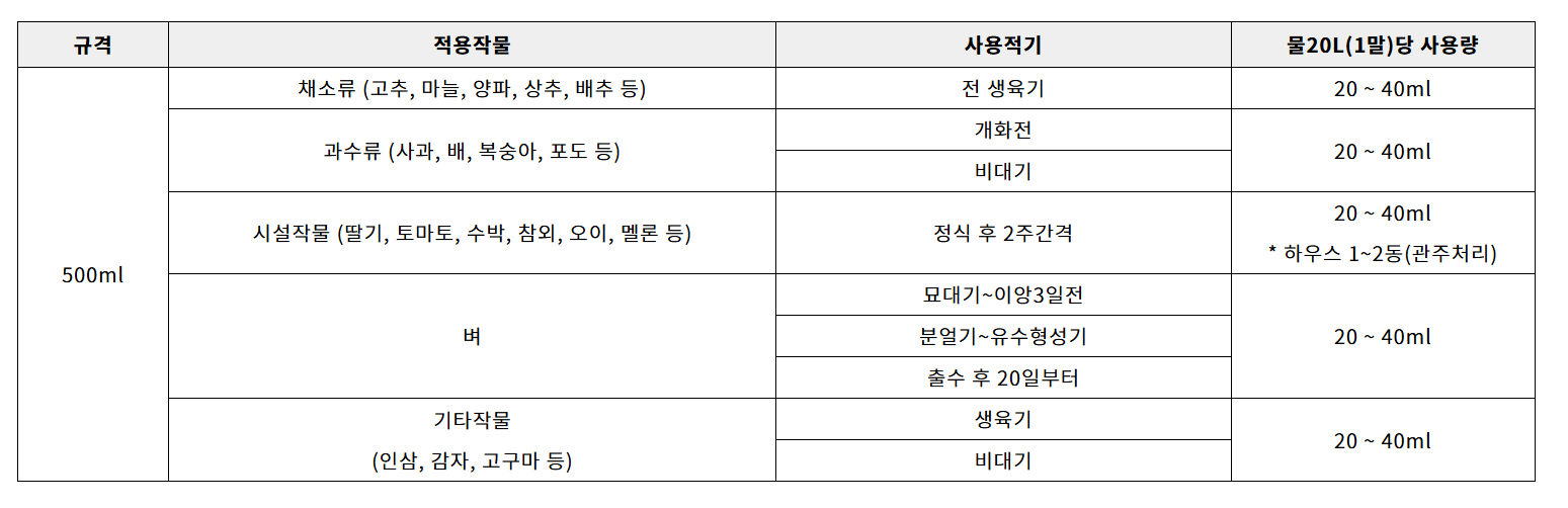 2. 식물의 에너지 대사, 영양 흡수, 호르몬 생성 등을 활성화하여 다양한 생리작용을 돕습니다.3. 작물이 단단하게 자라 병해충의 침입을 막을 수 있습니다.4. 유리아미노산이 작물의 각 기능을 적시에 활성화시켜, 자연스럽고 건강한 생육을 돕습니다.