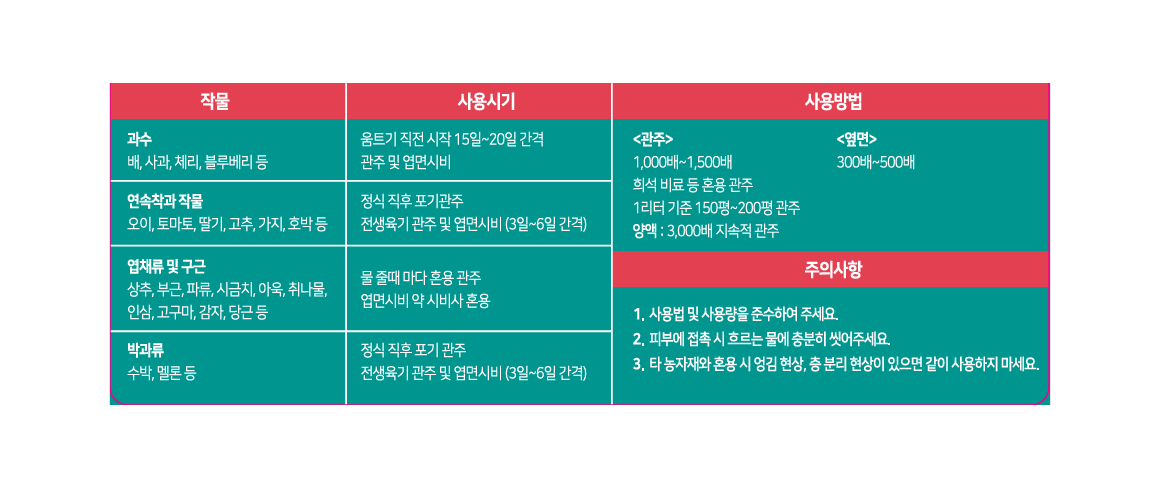 3. 타 농자재와 혼용 시 엉김 현상, 층 분리 현상이 있으면 같이 사용하지 마세요.